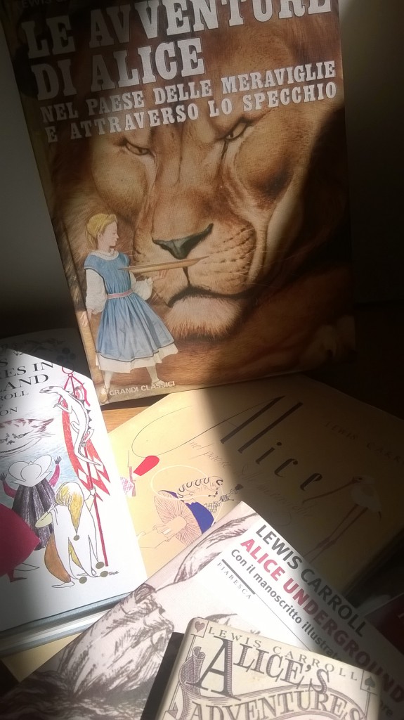 Non sapevo ancora leggere ma riconoscevo i libri dal dorso. Per dire la verità riuscivo a leggere lentamente alcune parole, come tutti i bambini che hanno imparato da poco, ma preferivo di gran lunga ascoltare le storie che mi venivano lette, guardando le pagine per gustare le immagini, i titoli in grassetto e l’avventuroso sfogliare della carta. Il libro di “Alice” era facilissimo da individuare nello scaffale: aveva un dorso più grosso degli altri (perché conteneva anche “Attraverso lo specchio”) e in copertina campeggiava la testa di un enorme leone che, felinamente infastidito, scrutava una leggiadra Alice in primo piano che portava un vassoio.