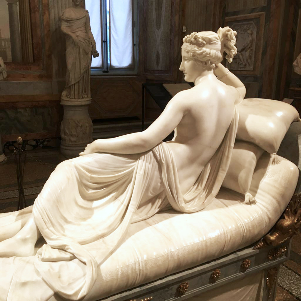 Rientrata a Parigi, Paolina riprese la vita spensierata di sempre, incontrando sul suo cammino Camillo Borghese, giovane principe appartenente a una delle più nobili e facoltose casate romane. Bello, elegante, ricchissimo e fascinoso nei suoi tratti mediterranei, il principe aveva tutte le doti per piacere alle signore della Parigi bene, a patto però che non aprisse bocca. Era allora, infatti, che la sua scarsa istruzione, unita a un’intelligenza meno che mediocre, si manifestava, facendolo apparire alla stregua di un babbeo, facile preda dei tanti più scaltri di lui. Allettato dalla prospettiva di vedere la sua famiglia imparentata con quella di un aristocratico di così alto lignaggio, Napoleone acconsentì di buon grado alle nozze della sorella con il Borghese, raccomandandole di seguirlo a Roma e di rispettarlo “come marito e come uomo”. Parole al vento perché, appena giunta nell’Urbe, Paolina iniziò ad annoiarsi cercando sollievo ancora una volta negli amanti. La prematura morte per un attacco malarico del figlioletto Dermide, di cui Paolina incolpò il coniuge perché l’aveva convinta a mandare il bambino a trascorrere l’estate nella calura di Frascati, a casa dello zio Luciano Bonaparte, guastò irreparabilmente i loro rapporti di coppia. A nulla valse lo splendido regalo fattole da Camillo, che nel 1804 incaricò il celeberrimo scultore Antonio Canova d’immortalare la moglie, seminuda in posa da “Venere vincitrice”, in una meravigliosa statua di marmo bianchissimo che all’epoca destò grande scandalo per il suo realismo.