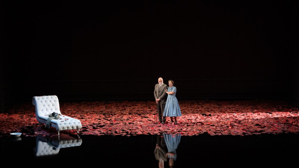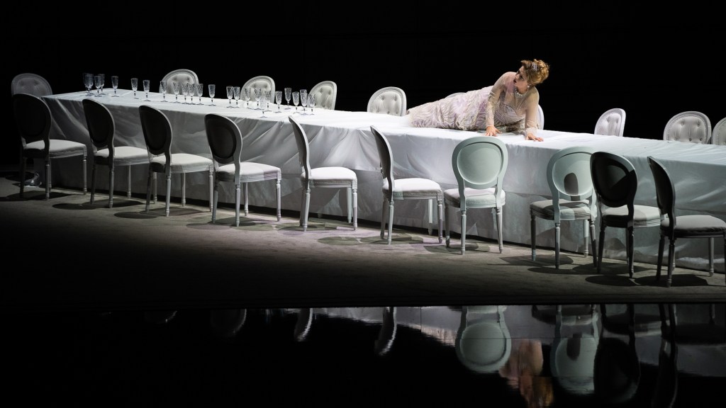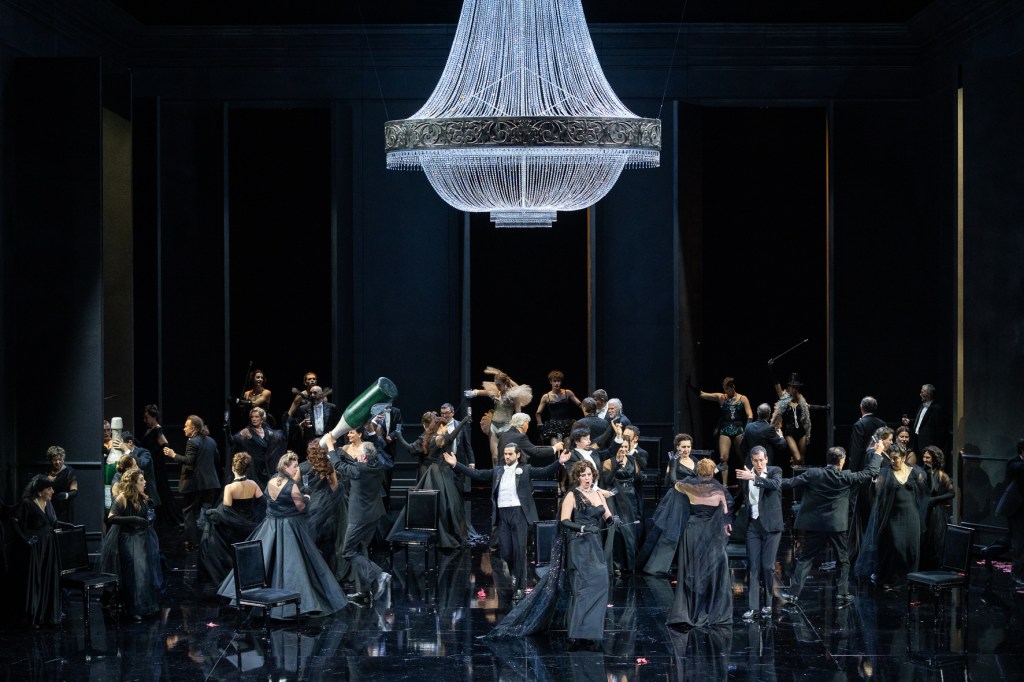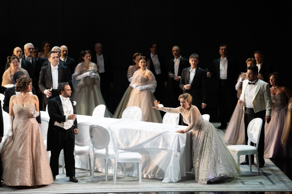 La regia è affidata a Arnaud Bernard che traspone l’azione in una Parigi anni ’50, stando agli splendidi costumi disegnati da Carla Ricotti che ben avrebbero figurato su una passerella haute couture dell’epoca! La regia mi ha ben disposto subito perché, all’apertura del sipario durante il preludio, Violetta si presenta subito per quello che è: una donna malata, di cui conosciamo tutti il mestiere grazie al quale riesce a vivere nel fasto. Niente crinoline, niente toreri e zingarelle, niente movenze affettate ma una donna quasi contemporanea che è consumata da un male, non diverso da quanto sentiamo quotidianamente nel cerchio parentale e di amicizie. Bernard, grazie all’impianto scenico quasi fisso ma di versatilità ed infinita elegante bellezza ideato da Alessandro Camera, sciorina la vicenda con grande maestria e la rara capacità di togliere piuttosto che aggiungere, di sottrarre per mettere in risalto l’essenza.