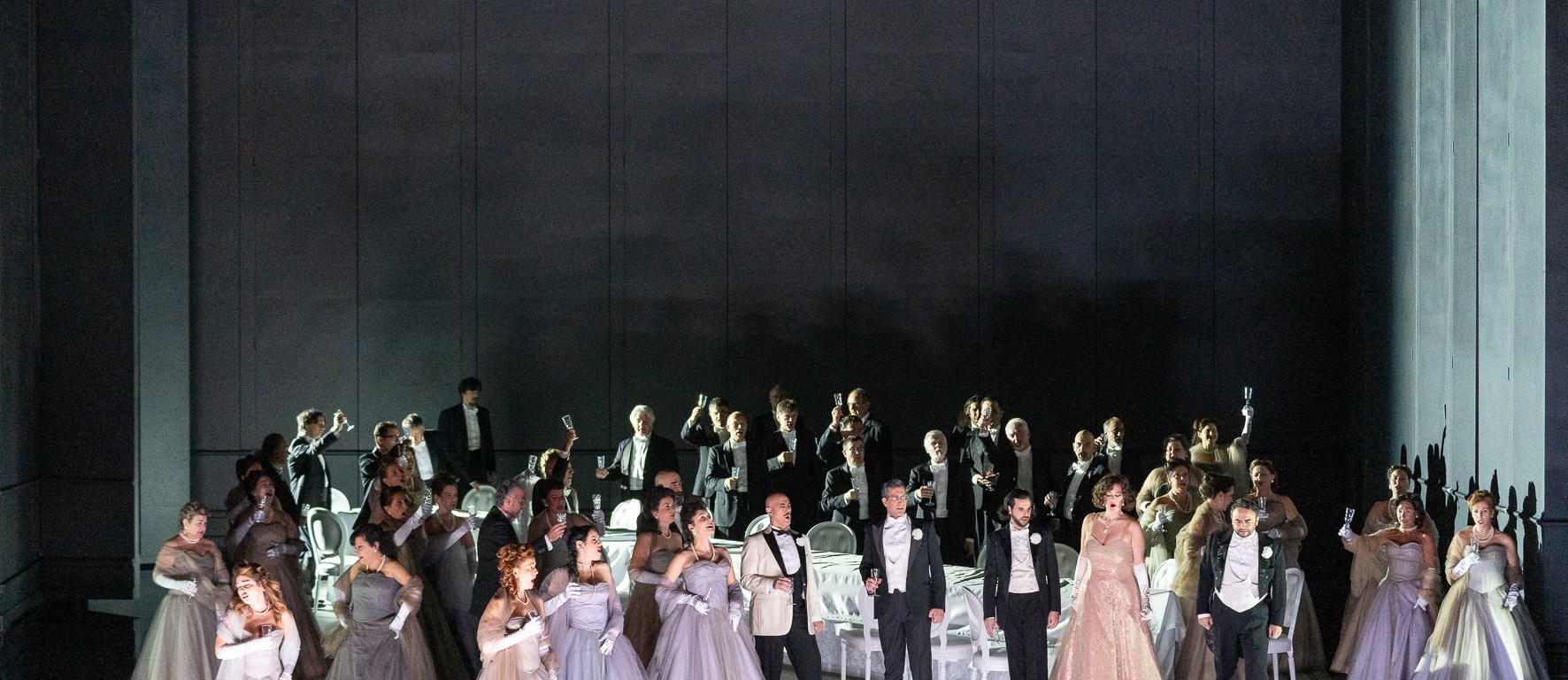 L’uso del Coro del teatro triestino, che sembra tornato alla duttilità e alla bravura interpretativa di quando trionfava nelle operette dirette da Gino Landi, è magistrale: l’utilizzo del freeze, del botta e risposta con il testo dei protagonisti è di grande effetto e di elevata plasticità, e contribuisce a togliere piuttosto che a ridondare come nelle canoniche controscene cui sono in genere costretti o disgraziatamente abituati. I continui atterramenti di Violetta, sia sotto la passione di Alfredo che per la debolezza in cui la malattia la prostra, sono talvolta fastidiosi ma anche necessari. Ancora bravo anche per l’impostazione del terzo atto dove, al posto del folclore ispanico, Bernard ci propone climi più lascivi e scabrosi, come ci aspetteremmo se partecipassimo ad una festa organizzata da Flora Bervoix! Ma forse non sarebbe stato il grande spettacolo che è stato senza il light design di Emanuele Agliati: scultoreo, tagliente, spietato ma altamente suggestivo in svariati momenti. Bravo anche a lui.