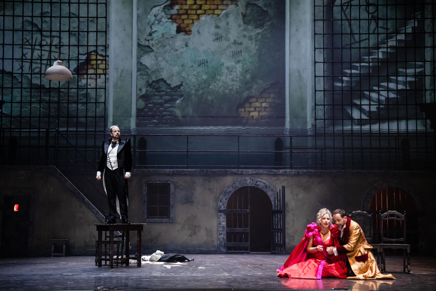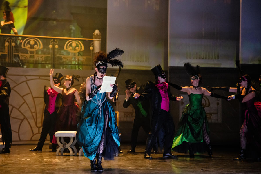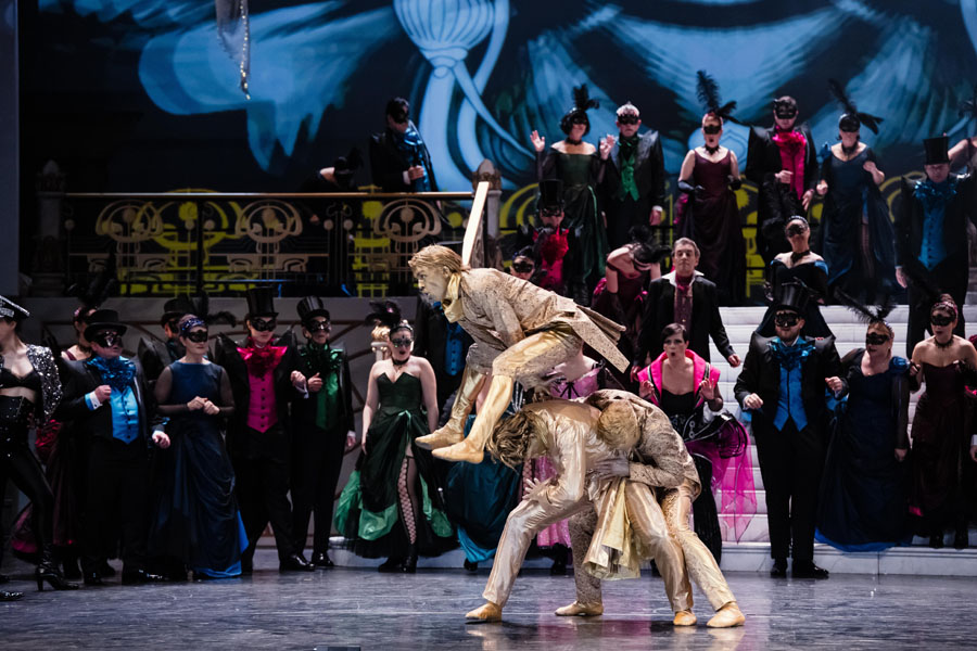 Questa operetta di Johann Strauss jr è giustamente un capolavoro. A cominciare dall’ouverture che sciorina gran parte dei temi che ascolteremo nel corso dei tre atti e che già da sola è un’opera d’arte compiuta. Se poi, alla guida dell’orchestra, troviamo Ayrton Desimpelaere, direttore principale dell’Orchestra della SNG di Lubiana, siamo in una botte di ferro! Ayrton, conferma la sua grande attenzione al palcoscenico, ai solisti quindi ma anche al coro e ai danzatori, senza per questo tralasciare di dare la propria raffinata lettura di Strauss: via i clamori bandistici, si a respiri e corone, grande spazio agli archi per farci scoprire toni di Strauss insolitamente delicati e poetici.