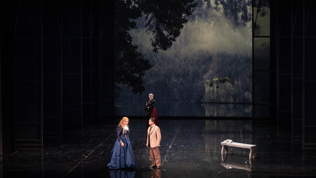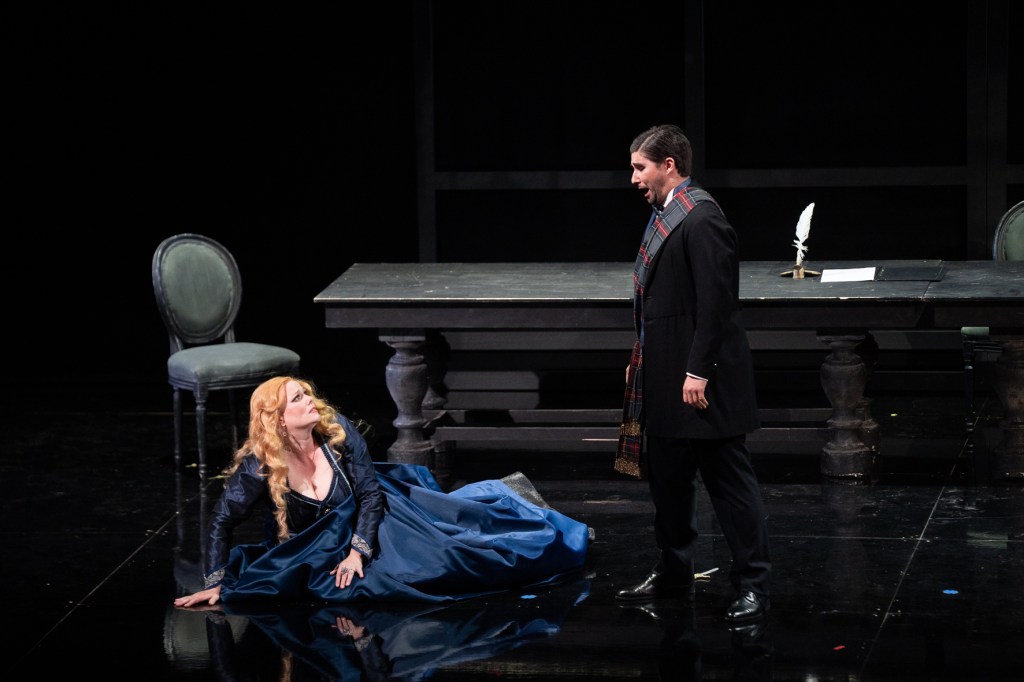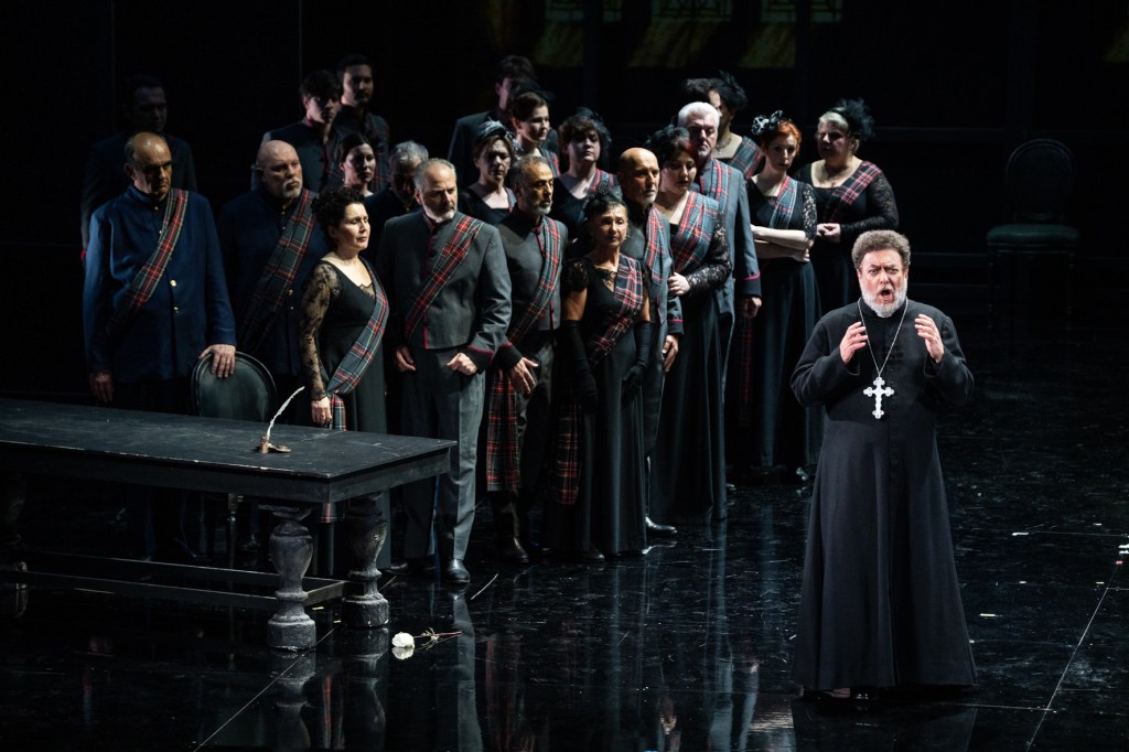 Ho trovato regia e allestimento serie e austeri ma, dopo l’ultima nefandezza vista sul palcoscenico del massimo triestino, mi è sembrata un miracolo di equilibrio ed eleganza. La molto tradizionale ma scorrevole regia è firmata da Bruno Berger-Gorski che si concede un unico volo pindarico nell’immaginare Lucia incinta di Edgardo mentre compie la mattanza di Arturo, appena sposato. La regia è centrata sui protagonisti che segue con cura ma poco sul coro che, a parte la scena terza del secondo atto dove sono chiamati a interpretare delle danze accennate ma piacevoli, è condannato alla solita immobilità schierata. Scene di Carmen Castanon e costumi di Claudio Martin, parimenti assortiti alle volontà del regista di rappresentare il cupo potere della Chiesa, le imposizioni, le guerre e il costante tentativo di non lasciar emancipare le donne.
