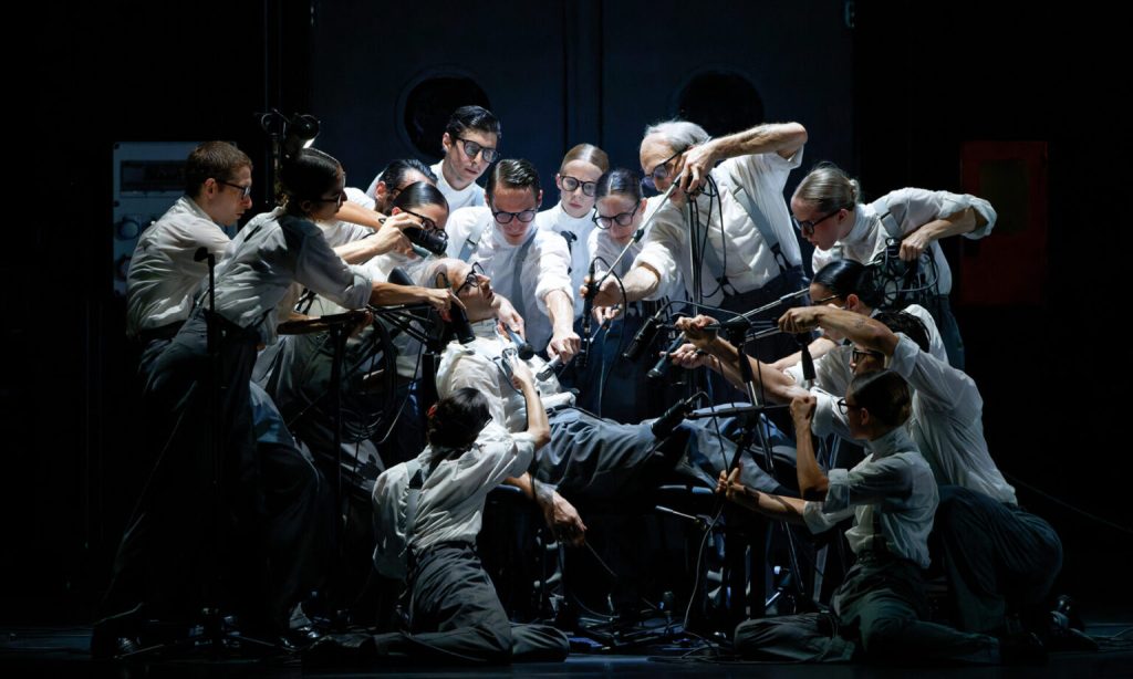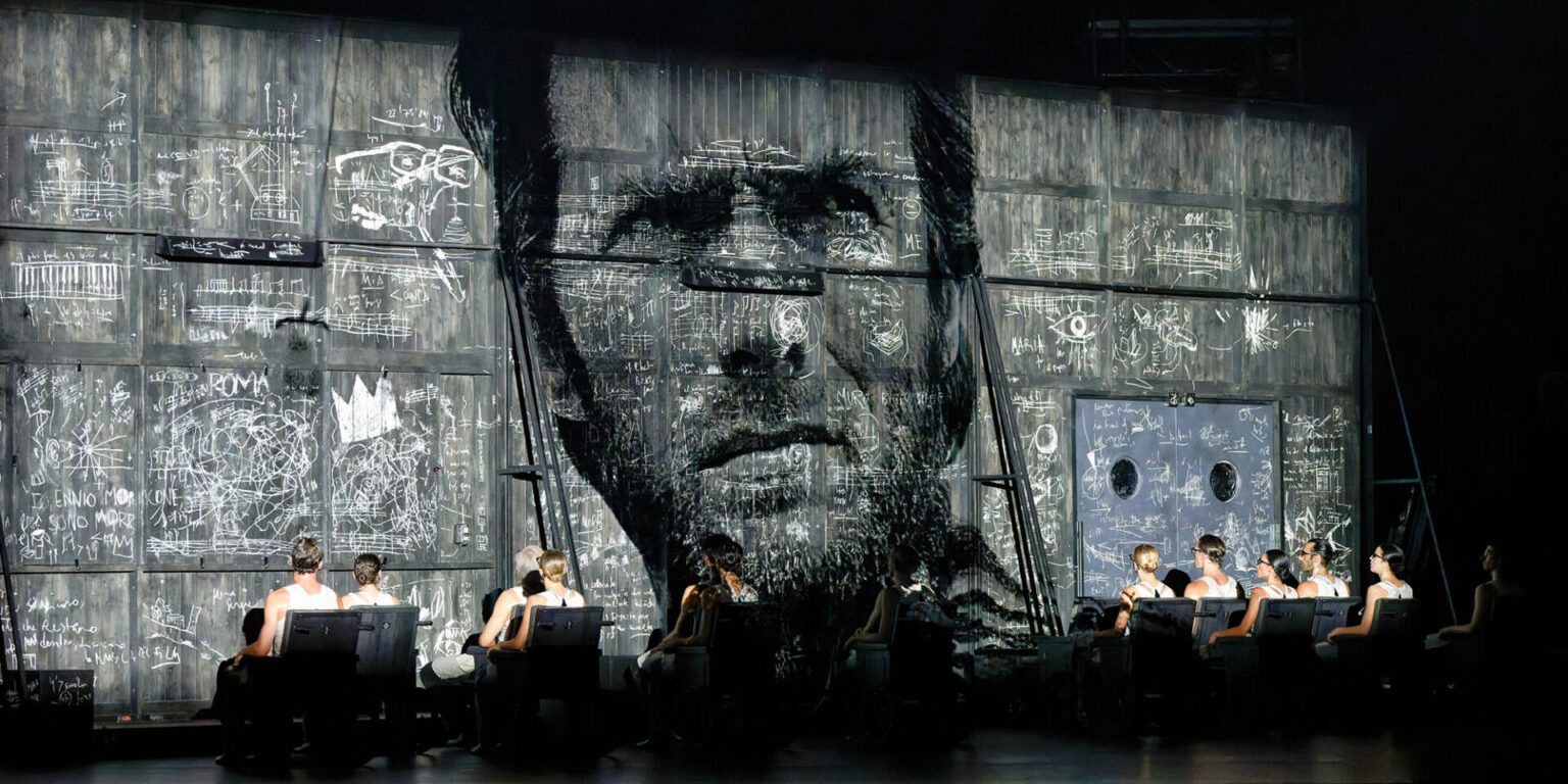 L’elaborato del coreografo e regista Marcos Morau segue alla lettera quanto sopra scritto ma al punto da risultare irriconoscibile nella narrazione, data la quantità di introspezione, concetti, materiali e azioni che propone. Lo spettacolo inizia proprio così, con dei lampioni accesi tenuti a mano da alcuni danzatori a ricordare che è notte, poi con un uomo, poi il suo doppio, una scrivania, dei suoni, la sua voce. Poi un lungometraggio di un’ora e mezzo che fila via velocissimo, che segue i pensieri affastellati, i ricordi, le immagini di ognuno di noi ma che, in questo caso, sono quelle del Premio Oscar Ennio Morricone. Ma senza aver letto quelle poche righe di presentazioni tutto sarà meno chiaro, con dei confini che saranno fusi gli uni negli altri e una quantità infinità di materiale proposto da digerire e organizzare.